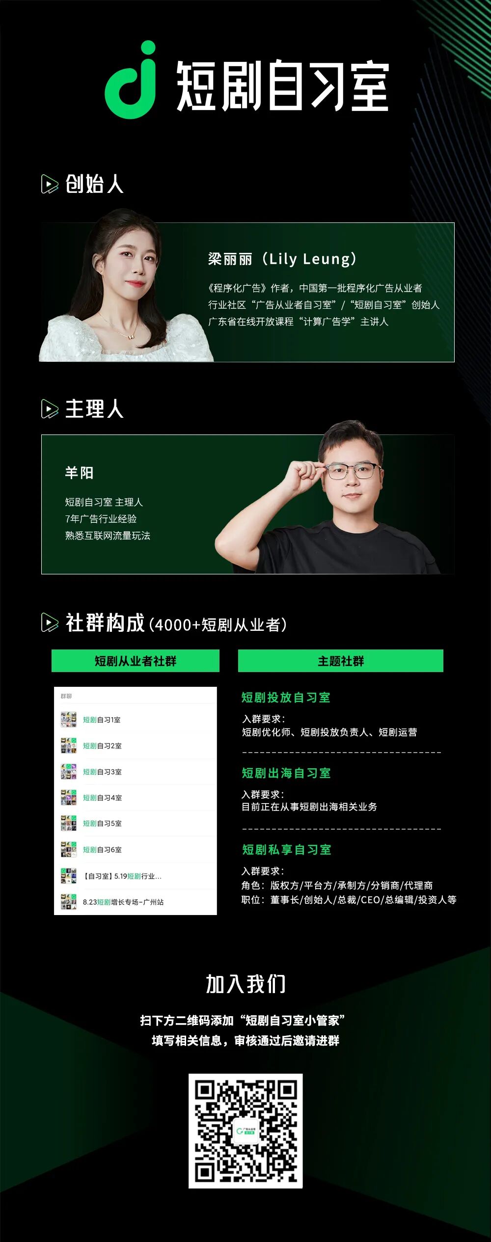 PS:如需加入短剧微信群,添加小管家微信(LilyLeung_333)填写相关资料,审核后邀请进群。也欢迎关注公众号,获取更多干货好文/活动资讯。