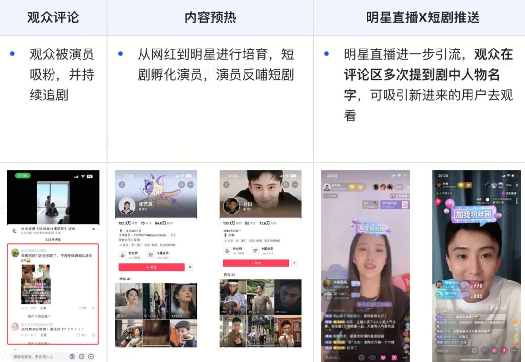 通过融合适配、人气高的短剧演员,绑定演员CP,打造达人流量效应,提升剧目的宣发力度,打造演员X用户的粘性。