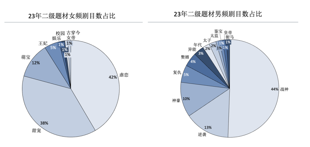 2022年以战神、赘婿、神豪、神医(总占比42%)主导,2023年上半年男频剧从战神、赘婿等题材分化出多个子分类,重生年代、穿越古代爆款频出
