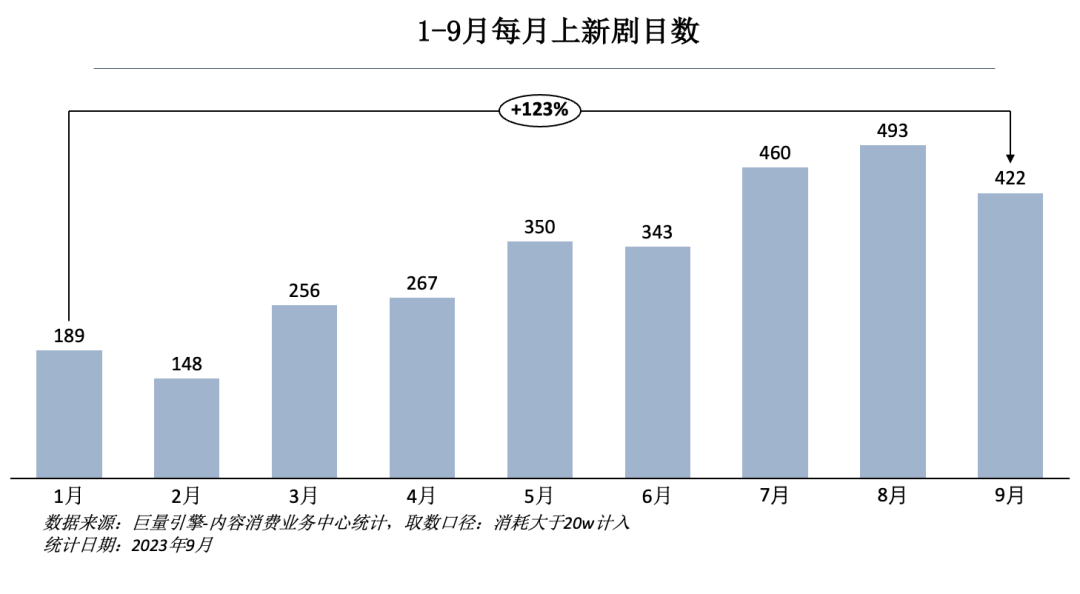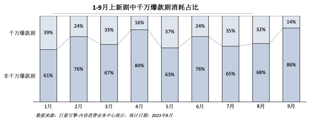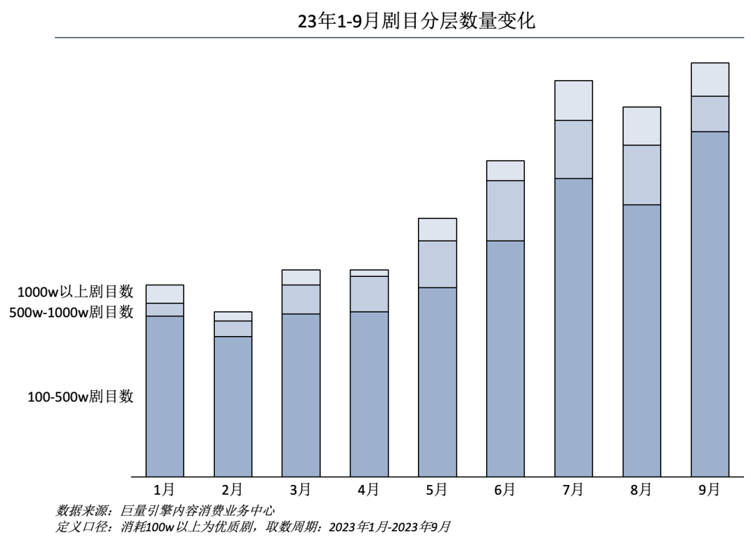 从优质剧供给来看:1-9月100w以上的剧从86部上涨到168部,整体环比上涨95%;千万爆款剧从8部上涨到15部,整体优质剧供给更加充足。从剧目分层消耗来看:1-9月500w+占比提升明显,剧目分层结构趋于健康,剧目结构整体更加优质。