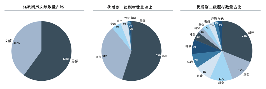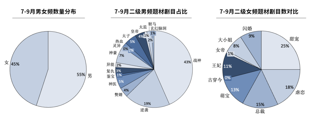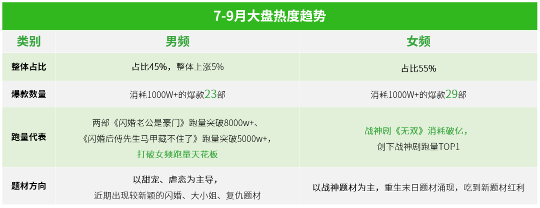 拍摄新颖类别题材需注意: 踩中大众的情绪点并狠狠若离,是爆款短剧的共性,在注重创新的同时仍需注意剧情推进的节奏,和每集预埋的钩子是否能抓住用户爽点、制造情绪爆点最为关键,注重内容和故事的打磨。2. 7-9月战神剧破峰,闪婚、复仇、末日新题材涌现7-9月优质剧整体女频占比45%,女频剧相比H1从40%上涨到45%,仍有上涨趋势。大方向上仍是甜宠、虐恋主导,近期出现较新颖的闪婚、大小姐、复仇题材,爆款率较高。7-9月优质剧整体男频占比55%,男频爆款剧仍以战神题材为主,国庆期间《腾龙》、《紫气东来》、《全球冰封我打造了末日安全屋》等新剧上线,重生末日题材涌现,吃到新题材红利。
