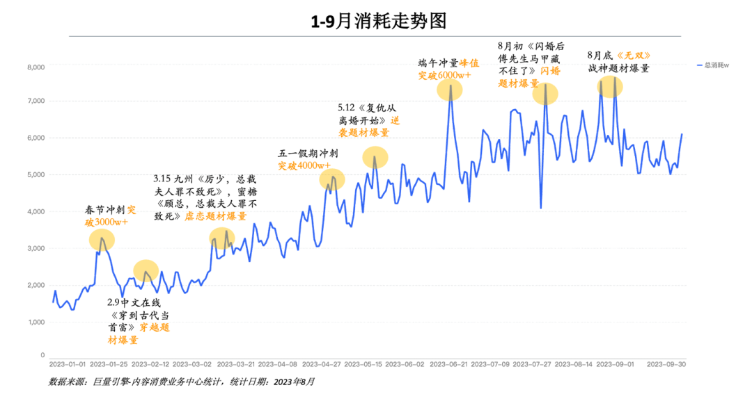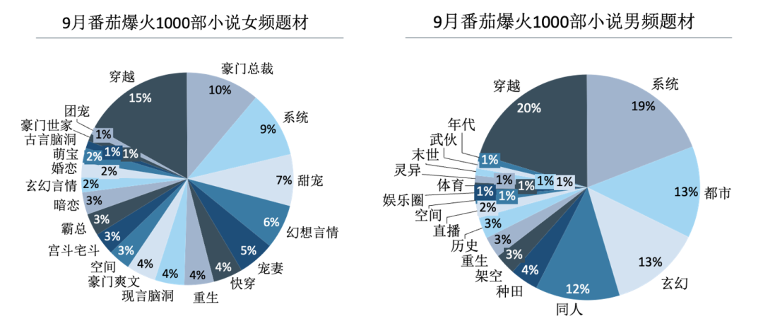3. 从近期热门小说题材,看短剧未来方向根据番茄小说1000本9月爆火新书类型,女频题材近期较热门为穿越、豪门总裁、系统、甜宠、幻想言情类,男频题材最热门为穿越、系统、都市、重生、玄幻等,整体与目前爆款剧的剧本题材趋于一致。值得关注的是,小说中穿越类在男女频均表现优异,占比最高,男频20%,女频15%。短剧题材穿越类整体占比9%,相较上半年穿越占比5%,7-9月穿越类占比上升为12%,穿越类题材有上升趋势。同时,小说中系统文占比在男女频中均较高,男频19%,女频9%。但短剧中系统类占比较少,仅1%,仍有较大挖掘空间。从原著小说到短剧剧本,学会挑IP、确定主线、设计人设,可以让短剧的改编事半功倍。  总结  目前短剧大盘消耗持续上涨,入局玩家不断增多,各方优质剧目数、千万爆款剧变多;平台方头部效应出现,制作方聚焦题材,整体趋势大好。题材趋势上,女频爆款的数量上涨明显,题材以虐恋、甜宠为主,出现闪婚、复仇等新颖类目。男频题材出现分化,以战神为主,同时涌现出重生年代、穿越太子、末日空间等系列爆款。创作方面可以采取小说IP的复用翻拍,演员IP的热门组合的使用剧本讲清人物叙事线条,设置新颖人设,注重爽点叠加公式: 人物内部叙事线+人物外部叙事线+亲情线+感情线+事业线+信仰线+人缘线。情节设置上,运用预埋钩子,配合付费卡点集前每集的功能,打造爆款剧。9月小说爆款整体爆款题材与短剧市场趋于一致,学会挑IP、确定主线、设计人设,可以让短剧的改编事半功倍。