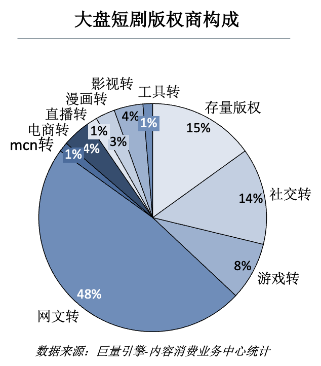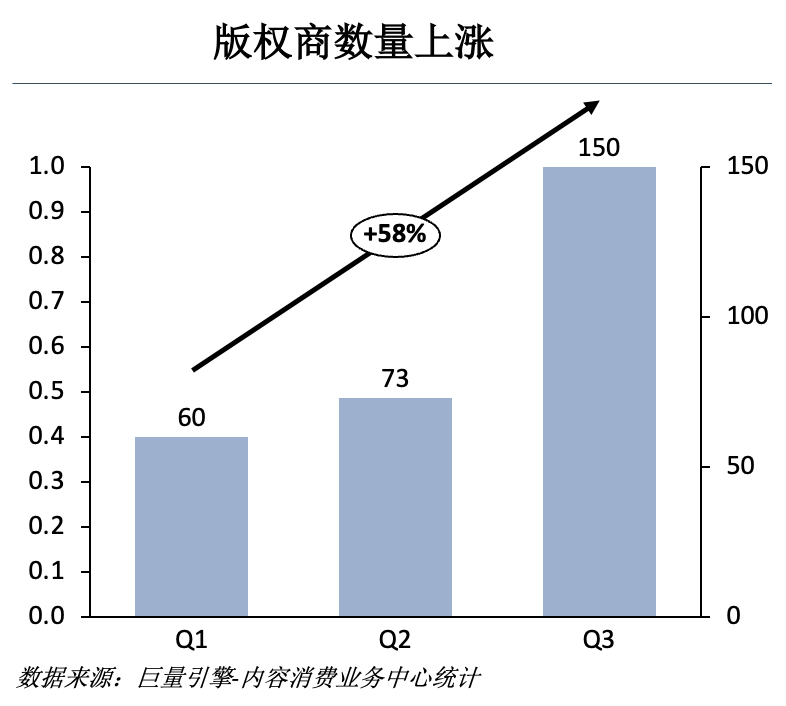 版权方规模持续扩大,产能供给增加,去年Q4到今年Q3,版权商数量从41家上涨到150家(精筛后),网文类转型最高占比48%,其次社交、游戏、电商、影视类亦纷纷成功转型。
