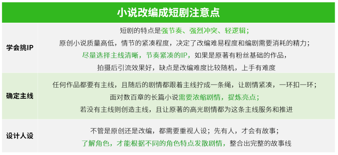 或将提取小说IP中的创新元素,关键爽点精炼二次创作;或将完播率更高、次留率更高、付费率更高的情节进行归类,用以往的优秀案例组合,做新剧改编,达到更好的跑量效果。