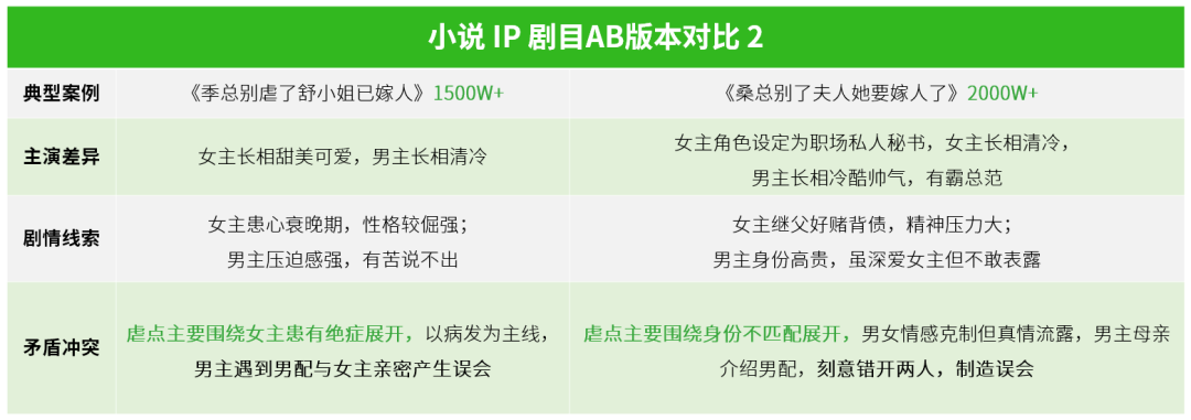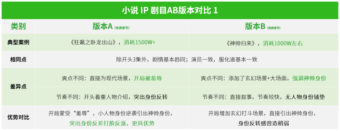 3. 从优质剧本精编,到爆款系列IP打造IP提升流量与用户粘性  ① 小说IP: a. 剧目AB版本同一剧本为了提升测出率,设计成AB版本(免费章节),通过设置不同的爽点,在付费章节之前形成差异化,吸引用户付费。经验借鉴: 两版本通过前几集不同的翻拍,预期成本增加5~10%,但两部剧均实现了较高的消耗量级,整体看性价比极高。当挖掘到有合适的剧本时,可以通过提高小成本预算,翻拍AB版本,营造出人物差、故事差,打造不同的反转(如打造“被羞辱”-“战神”;“战神修炼下山”两个对比场景),提升可投可测的空间。b. 小说IP改编复用:爆款小说IP改编的剧目起量率较高,案例表明优质的小说IP可以不断的进行改编翻拍,通过调整优化主演、画面、矛盾冲突、人物设定,打造剧与剧之间的差异,创造更高的流量价值。经验借鉴:用市场验证过的爆款小说IP翻拍,起量剧二次翻拍,提升优质剧本的复用率打造爆款。