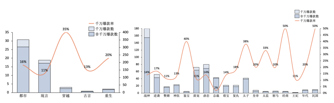 ① 追热门:男频类目中都市战神、逆袭、复仇,女频类目中现言甜宠、虐恋、萌宝千万爆款率在10-20%左右,为大盘主要测出题材,尝试入局时可优先考虑这些核心爆款品类,拆解爆款学习。