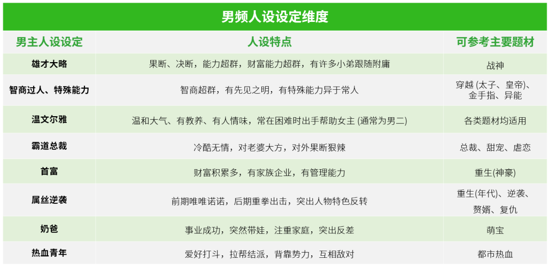 剖析爽点人物设置,挖掘未来方向  短剧以“爽”为主要核心元素,通过融入各种爽文套路,调动起用户的爽感情绪。下文通过人物-剧情线索-剧情结构-爆款剧四个维度,深度剖析爽剧人设、故事、剧情脉络,找到未来爽剧潜在的发展方向。1. 塑造主角人设,抓住共性公式爽文中的主角如何塑造?如何才能爽?
