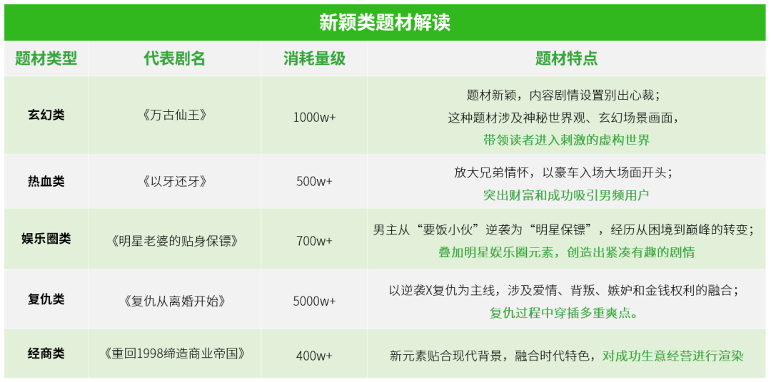 可关注上半年投放规模大,题材新颖,复拍题材,内容供给较少的类别,如玄幻、热血、娱乐圈、复仇、经商跑量数据表现优异,有起量探索空间。