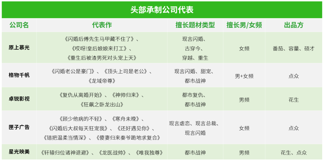 目前承制方市场大盘由信息流制作公司为主,信息流视频制作公司(代表西安等闲)50%>传统影视公司(代表西安星光影视)30-40%>MCN公司 (代表麦嘉禾) 10-20%,“保底+分成”模式成为短剧承制的主流模式。目前头部承制公司擅长的题材逐步形成差异化和聚焦化,已具备相关的男/女频优势如战神类、闪婚类。