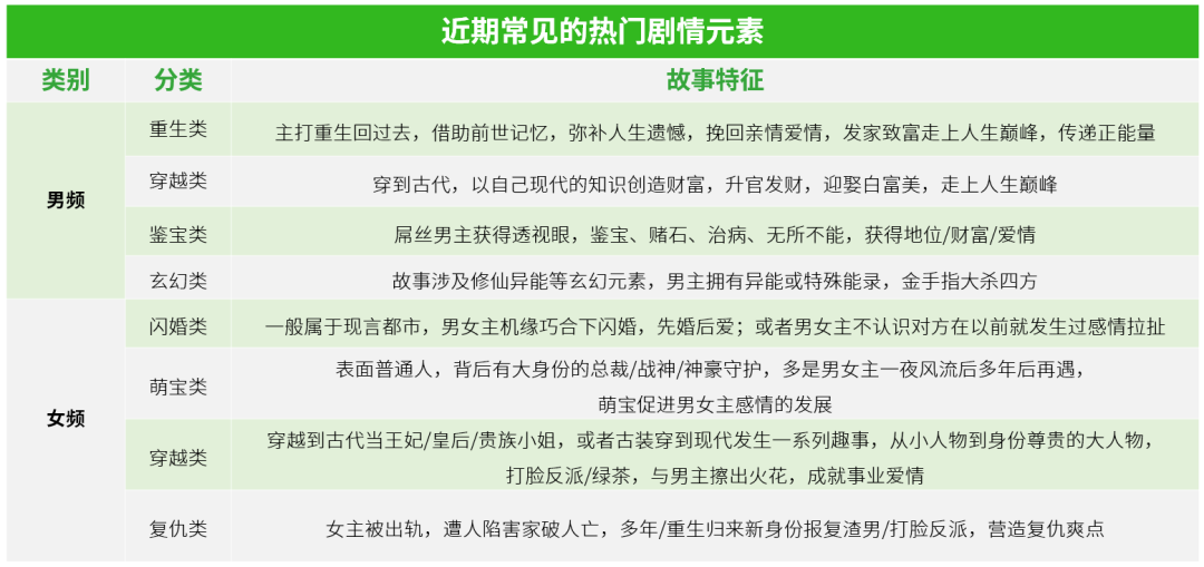2023年上半年女频剧虐恋题材呈现主导趋势,闪婚甜宠、古言、复仇等细分品类逐步探索,涌现出高流量高人气绑定的演员CP助推女频爆款产生,热门题材元素如重生穿越后xxx、渣了死对头、替嫁冲喜、先婚后爱。② 男频题材分化,穿越、重生热度大幅增加